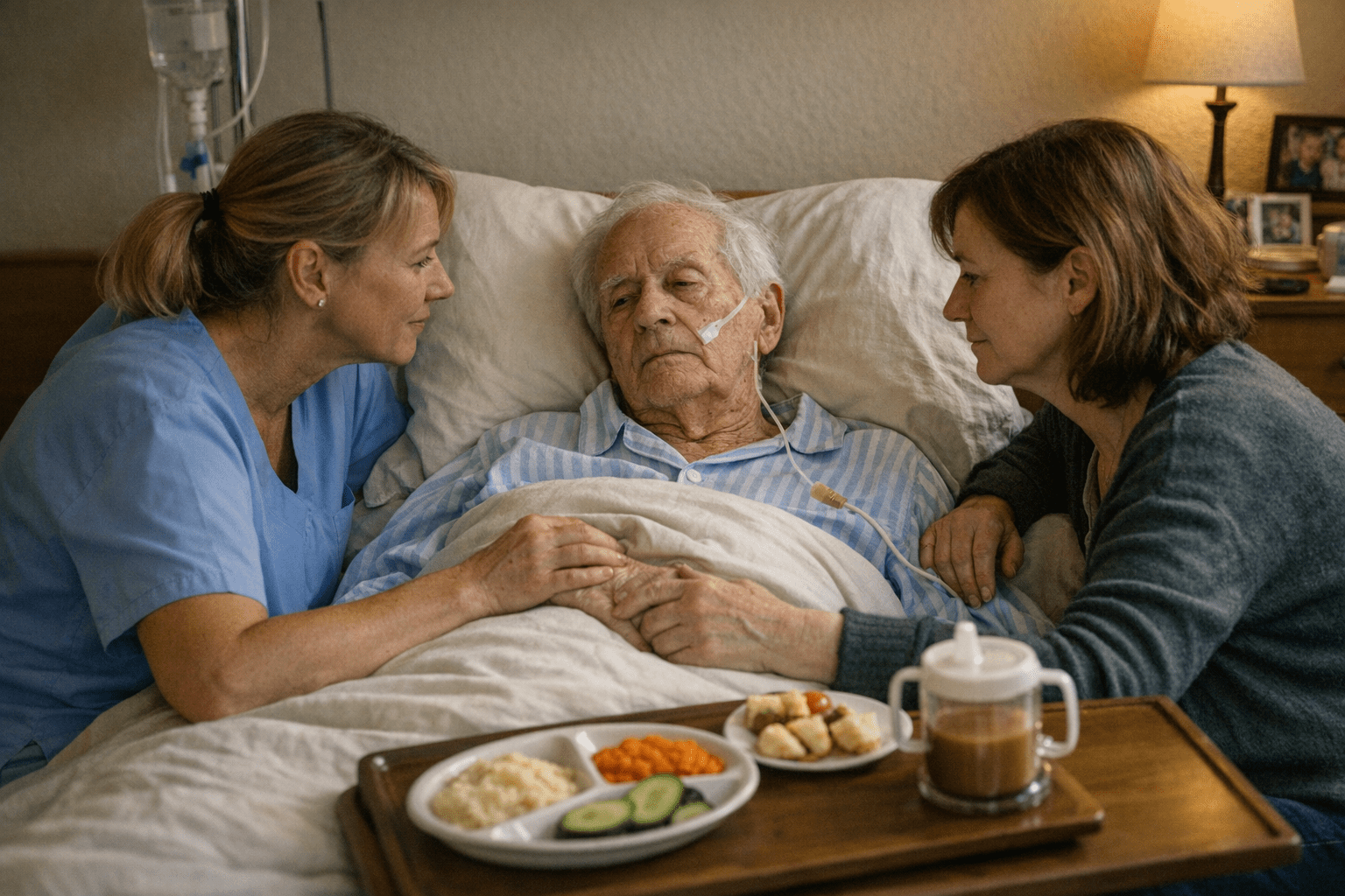 PEG-Sonde auf Nachttisch und Angehörige im Gespräch mit Arzt